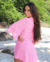 A Saída de praia Sereia Chic é a expressão da delicadeza com toque de sofisticação. Produzida em tecido estilo renda, todo furadinho, com transparência elegante, ela proporciona um visual leve, romântico e ao mesmo tempo marcante. Seu caimento fluído valoriza o corpo com naturalidade, enquanto a amarração ajustável na cintura permite usar mais solta ou acinturada. Com mangas amplas e comprimento perfeito para cobrir com leveza sem esconder o biquíni, essa peça é ideal para quem busca charme e conforto.